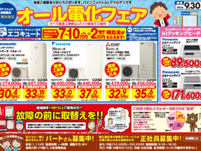 毎度ご愛顧ありがとうございます。 パナソニックショップマルデンです。 2026年9月30日(水)までオール電化フェアを開催いたします! すべて標準工事費込みのズバリ価格でご提供! 給湯器を10年以上ご使用の方は、 これを..